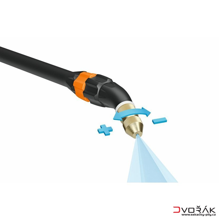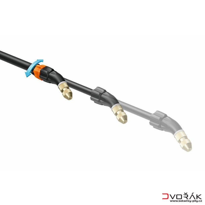 Variabilní tryska s nastavitelnou postřikovací tyčí umožňuje beznástrojové nastavení délky od 52 cm do 90 cm. Skvělé pro pohodlné ošetření i vyšších rostlin nebo vzdálenějších míst.