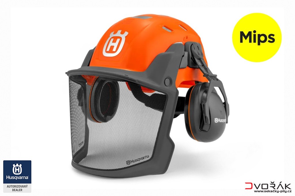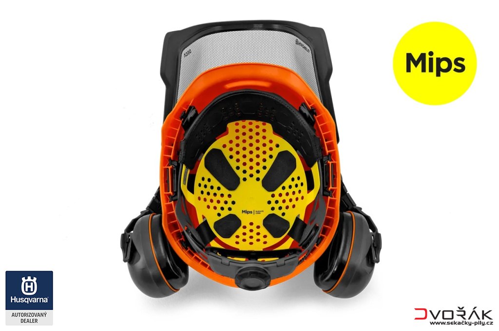 Přilba Husqvarna Technical vybavená bezpečnostním systémem Mips® pro lesnické přilby. Systém Mips® umožňuje pohyb uvnitř přilby, což v určitých nárazech pod úhlem pomáhá přesměrovat rotační pohyb od hlavy.