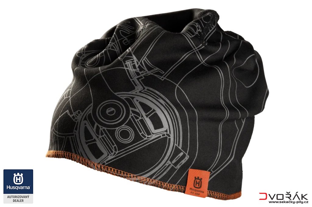 Černá pleteninová čepice Husqvarna Beanie zdobená šedým potiskem průkopnické pily Husqvarna.