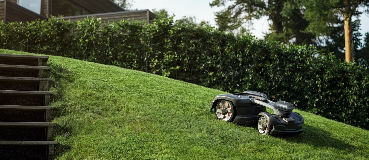 Modely Automower® AWD jsou vybaveny technologií, která optimalizuje ovládání každého kola pro vynikající provoz v nejnáročnějším terénu, s působivým výkonem ve svahu, kdy zvládá až 70% (35°) sklon.